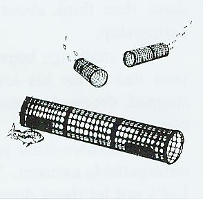 Description: Construction material for the Bass Bungalow is similar to the Crappie Condo. Plastic snow fence is rolled to form a 16-inch-diameter tube 6 ft. long. Plastic zip ties hold the fencing to four plastic rings that provide shaping. Cement blocks are placed in each end to restrict entry and provide anchoring.