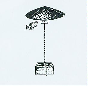 Description: The Magic Mushroom is constructed from a plastic hat similar to that used on the Crappie Condo. Flotation is placed under the hat, and a cable or rope is used to set the distance the hat floats from the bottom. Anchoring can be achieved by tying the rope to a cement block, earth anchor, or rock.